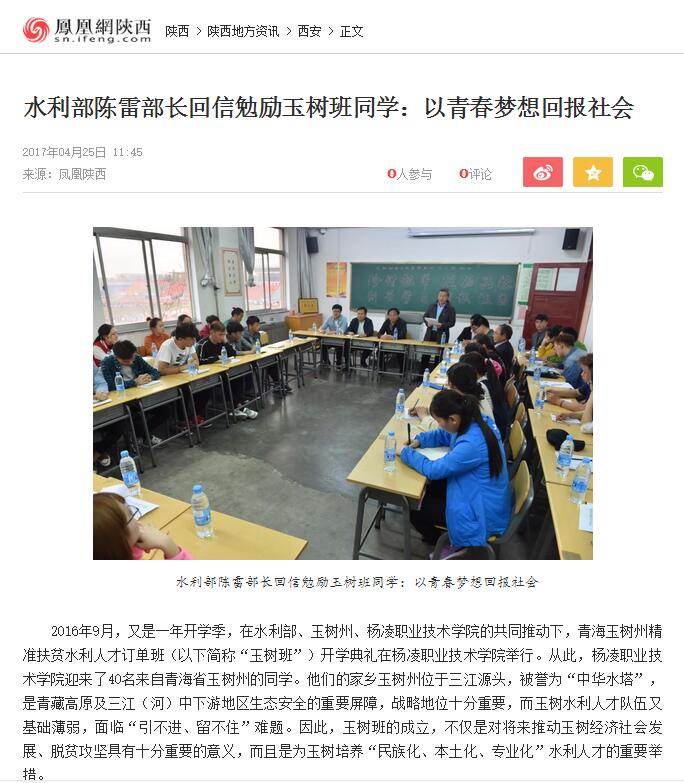 2016年9月,又是一年开学季,在水利部、玉树州、杨凌职业技术学院的共同推动下,青海玉树州精准扶贫水利人才订单班(以下简称“玉树班”)开学典礼在杨凌职业技术学院举行。从此,杨凌职业技术学院迎来了40名来自青海省玉树州的同学。他们的家乡玉树州位于三江源头,被誉为“中华水塔”,是青藏高原及三江(河)中下游地区生态安全的重要屏障,战略地位十分重要,而玉树水利人才队伍又基础薄弱,面临“引不进、留不住”难题。因此,玉树班的成立,不仅是对将来推动玉树经济社会发展、脱贫攻坚具有十分重要的意义,而且是为玉树培养“民族化、本土化、专业化”水利人才的重要举措。