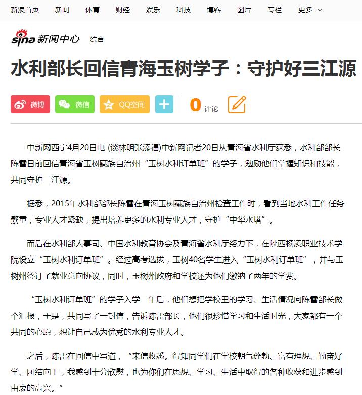 而后在水利部人事司、中国水利教育协会及青海省水利厅努力下,在陕西杨凌职业技术学院设立“玉树水利订单班”。经过高考选拔,玉树40名学生进入“玉树水利订单班”,并与玉树州签订了就业意向协议,同时,玉树州政府和学校还为他们缴纳了两年的学费。