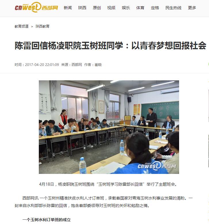 4月17日,玉树班同学们等到了“陈伯伯”的回信,饱含关怀和勉励的回信让同学们激动不已。4月18日,在班主任韩红亮的主持下,玉树班围绕“玉树班学习陈雷部长回信”举行了主题班会。杨凌职业技术学院院长王周锁、水利工程分院主要负责人参加了主题班会。