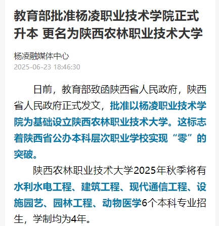 日前,教育部致函陕西省人民政府,陕西省人民政府正式发文,批准以杨凌职业技术学院为基础设立电子游艺官网。这标志着陕西省公办本科层次职业学校实现“零”的突破。