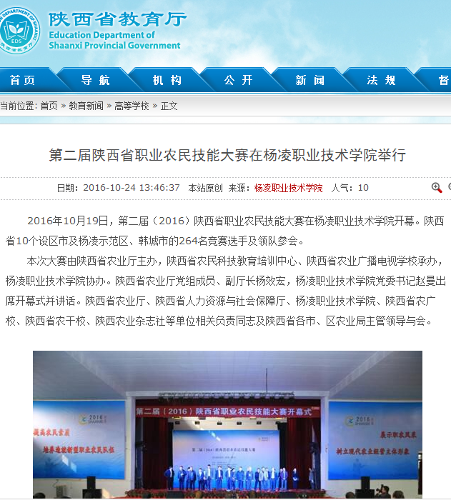 10月24日,陕西省教育厅网报道了第二届陕西省职业农民技能大赛在我院举行的有关情况。