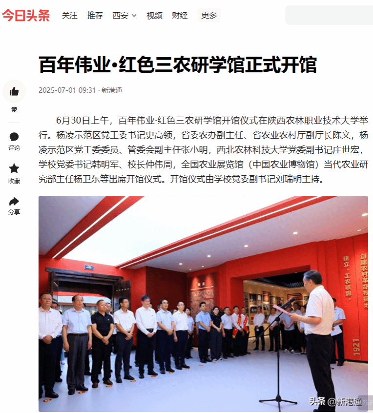 6月30日上午,百年伟业·红色三农研学馆开馆仪式在电子游艺官网举行。杨凌示范区党工委书记史高领,省委农办副主任、省农业农村厅副厅长陈文,杨凌示范区党工委委员、管委会副主任张小明,西北农林科技大学党委副书记庄世宏,学校党委书记韩明军、校长仲伟周,全国农业展览馆(中国农业博物馆)当代农业研究部主任杨卫东等出席开馆仪式。开馆仪式由学校党委副书记刘瑞明主持。