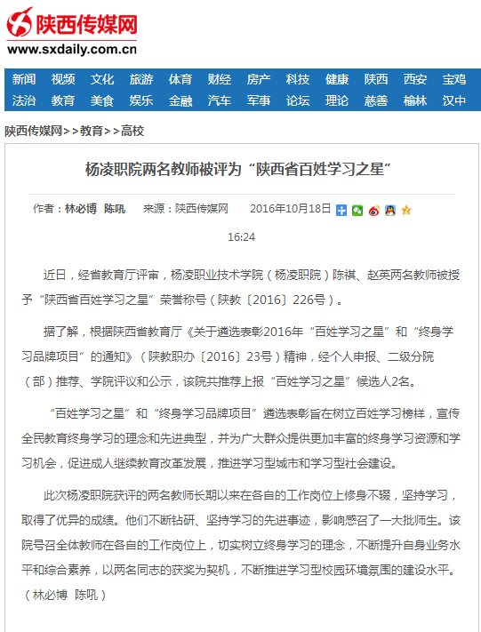 近日,经省教育厅评审,杨凌职业技术学院(杨凌职院)陈祺、赵英两名教师被授予“陕西省百姓学习之星”荣誉称号(陕教〔2016〕226号)。