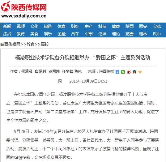 在庆祝新中国成立67周年之际,杨凌职业技术学院各二级分院相继举办了十大节庆之“爱国之怀”主题系列活动,旨在表达广大师生为祖国母亲庆生的爱国热情,同时,也是该学院全面启动“第二课堂成绩单”工作,充分发挥学生社团的育人功能,促进学生个性发展的题中之义。