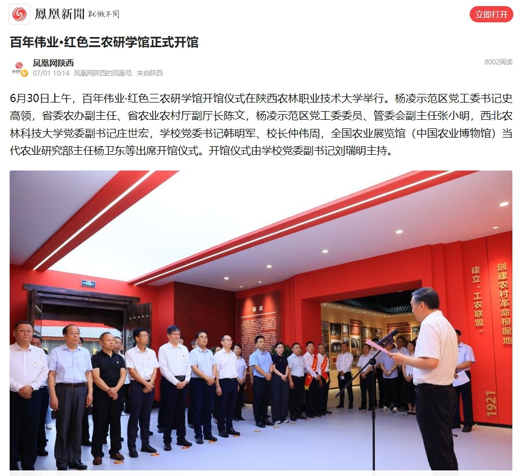 6月30日上午,百年伟业·红色三农研学馆开馆仪式在电子游艺官网举行。杨凌示范区党工委书记史高领,省委农办副主任、省农业农村厅副厅长陈文,杨凌示范区党工委委员、管委会副主任张小明,西北农林科技大学党委副书记庄世宏,学校党委书记韩明军、校长仲伟周,全国农业展览馆(中国农业博物馆)当代农业研究部主任杨卫东等出席开馆仪式。开馆仪式由学校党委副书记刘瑞明主持。