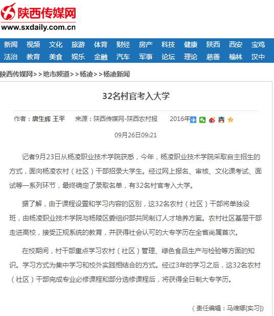 记者923日从杨凌职业技术学院获悉,今年,杨凌职业技术学院采取自主招生的方式,面向杨凌农村(社区)干部招录大学生。经过网上报名、审核、文化课考试、面试等一系列环节,最终确定了录取名单,有32名村官考入大学。