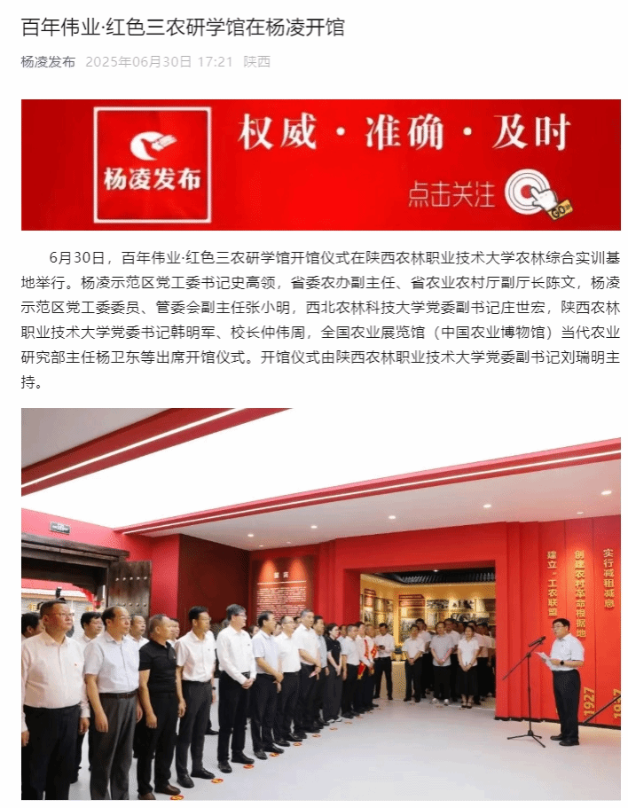 6月30日,百年伟业·红色三农研学馆开馆仪式在电子游艺官网农林综合实训基地举行。杨凌示范区党工委书记史高领,省委农办副主任、省农业农村厅副厅长陈文,杨凌示范区党工委委员、管委会副主任张小明,西北农林科技大学党委副书记庄世宏,电子游艺官网党委书记韩明军、校长仲伟周,全国农业展览馆(中国农业博物馆)当代农业研究部主任杨卫东等出席开馆仪式。开馆仪式由电子游艺官网党委副书记刘瑞明主持。