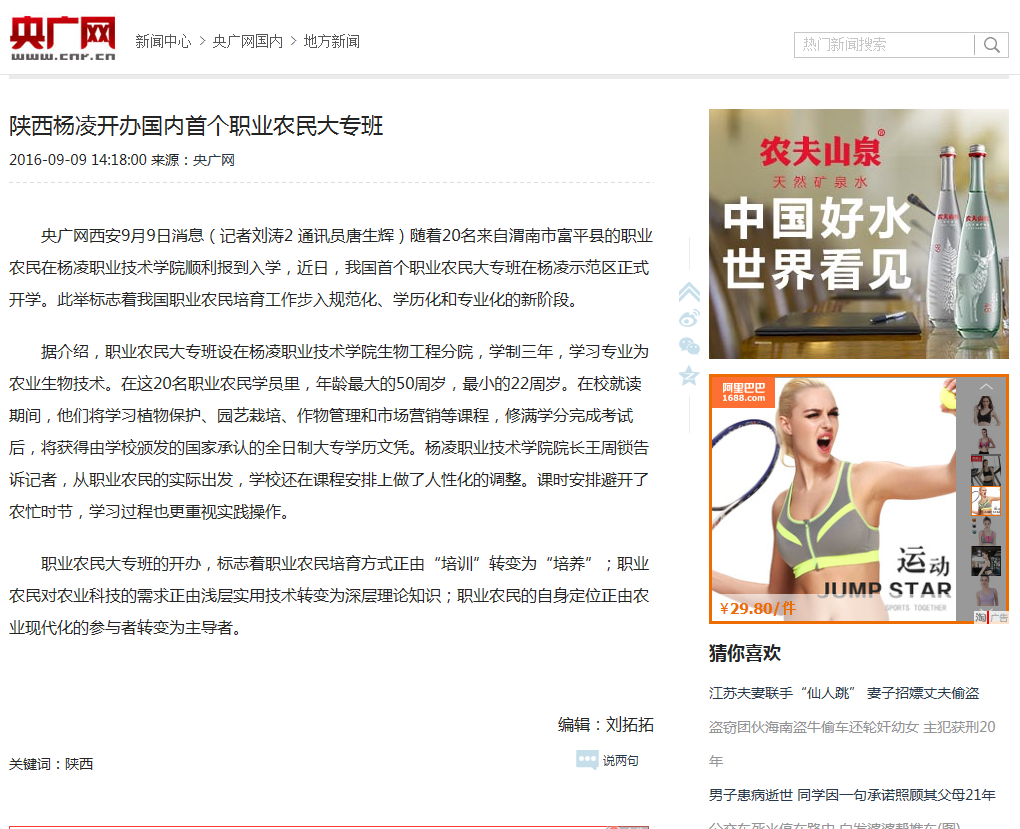 央广网西安9月9日消息(记者刘涛2 通讯员唐生辉)随着20名来自渭南市富平县的职业农民在杨凌职业技术学院顺利报到入学,近日,我国首个职业农民大专班在杨凌示范区正式开学。此举标志着我国职业农民培育工作步入规范化、学历化和专业化的新阶段。