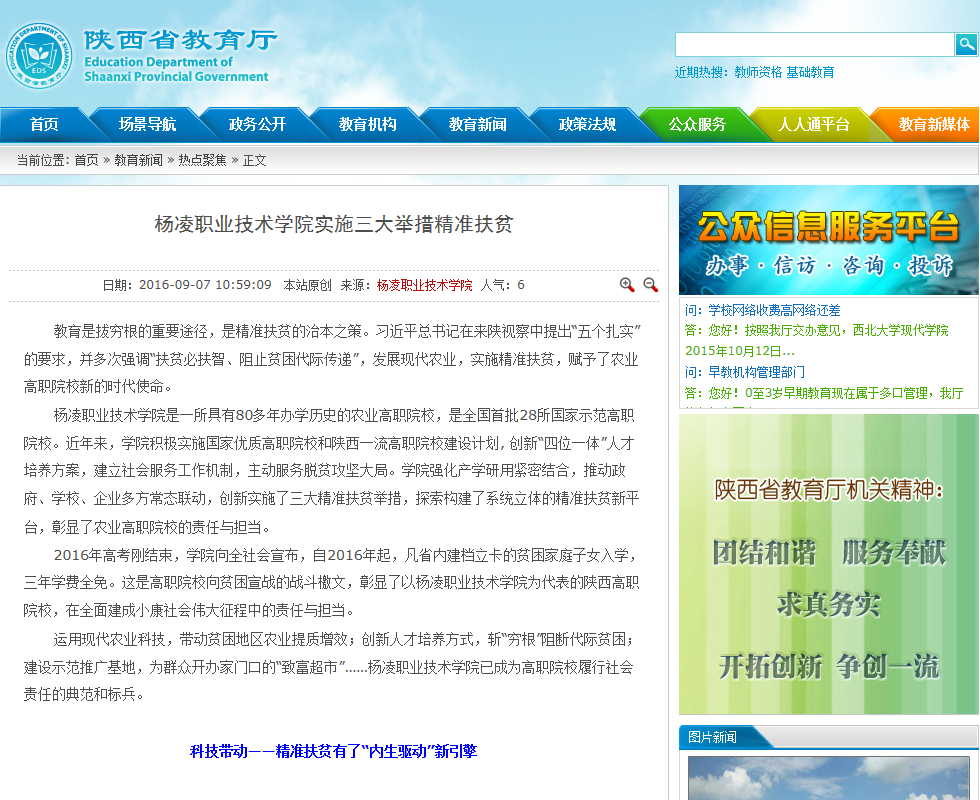 97日,陕西省教育厅网“热点聚焦”栏目,报道了我院实施三大举措,开展精准扶贫工作(详情进入)