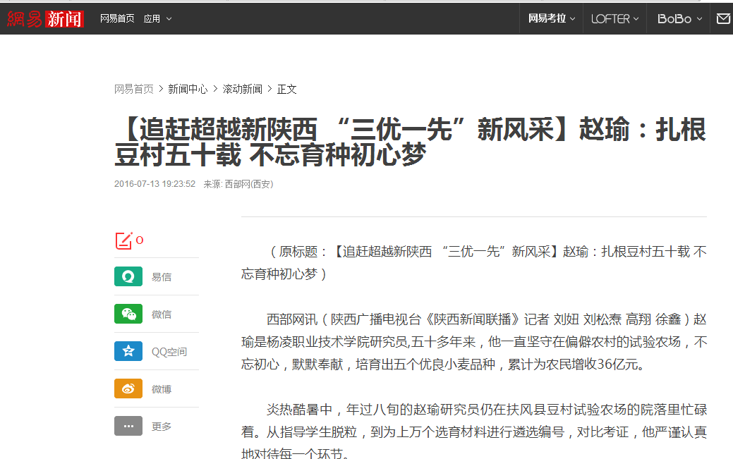 西部网讯(陕西广播电视台《陕西新闻联播》记者 刘妞 刘松焘高翔 徐鑫)赵瑜是杨凌职业技术学院研究员,五十多年来,他一直坚守在偏僻农村的试验农场,不忘初心,默默奉献,培育出五个优良小麦品种,累计为农民增收36亿元。