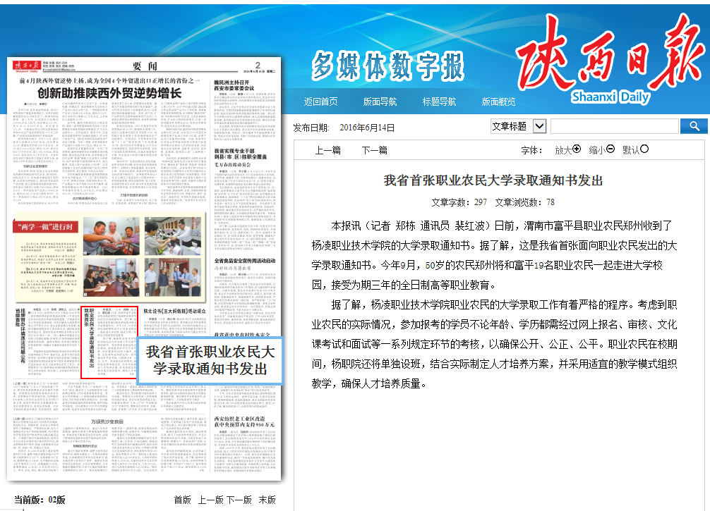 本报讯(记者 郑栋 通讯员 裴红波)日前,渭南市富平县职业农民郑州收到了杨凌职业技术学院的大学录取通知书。据了解,这是我省首张面向职业农民发出的大学录取通知书。今年9月,50岁的农民郑州将和富平19名职业农民一起走进大学校园,接受为期三年的全日制高等职业教育。