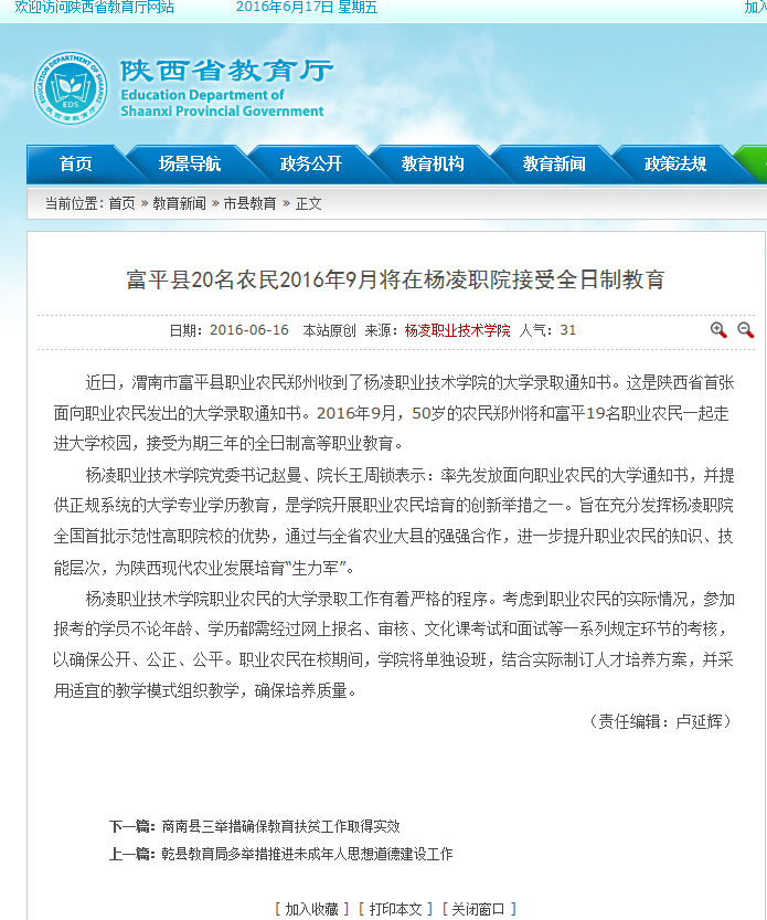 近日,渭南市富平县职业农民郑州收到了杨凌职业技术学院的大学录取通知书。这是陕西省首张面向职业农民发出的大学录取通知书。2016年9月,50岁的农民郑州将和富平19名职业农民一起走进大学校园,接受为期三年的全日制高等职业教育。