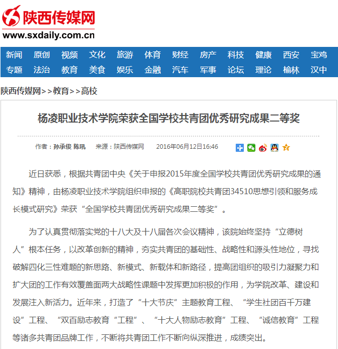 近日获悉,根据共青团中央《关于申报2015年度全国学校共青团优秀研究成果的通知》精神,由杨凌职业技术学院组织申报的《高职院校共青团34510思想引领和服务成长模式研究》荣获“全国学校共青团优秀研究成果二等奖”。