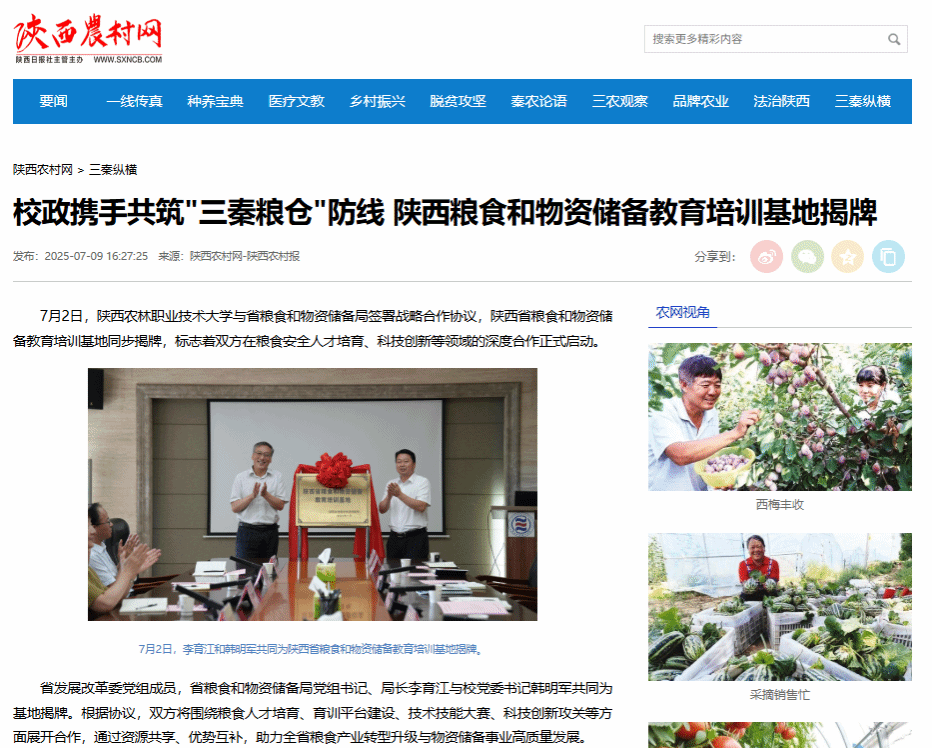 7月2日,电子游艺官网与省粮食和物资储备局签署战略合作协议,陕西省粮食和物资储备教育培训基地同步揭牌,标志着双方在粮食安全人才培育、科技创新等领域的深度合作正式启动。