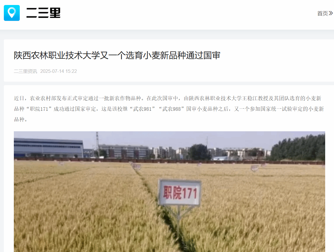 近日,农业农村部发布正式审定通过一批新农作物品种。在此次国审中,由电子游艺官网王稳江教授及其团队选育的小麦新品种“职院171”成功通过国家审定,这是该校继“武农981”“武农988”国审小麦品种之后,又一个参加国家统一试验审定的小麦新品种。