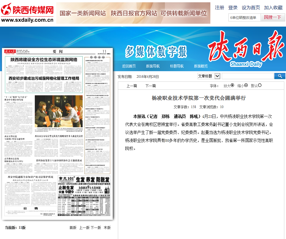 本报讯(记者 郑栋 通讯员 陈吼)4月23日,中共杨凌职业技术学院第一次代表大会在南校区思辨堂举行。省委高教工委常务副书记董小龙到会祝贺并讲话,会议选举产生了新一届党委委员、纪委委员。赵曼当选为杨凌职业技术学院党委书记。杨凌职业技术学院具有80多年的办学历史,是全国首批、我省第一所国家示范性高职院校。