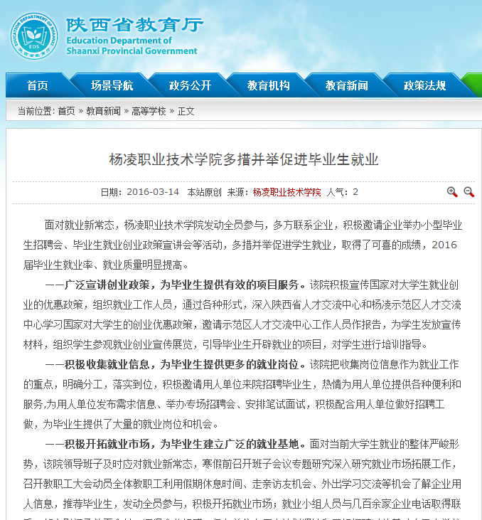 面对就业新常态,杨凌职业技术学院发动全员参与,多方联系企业,积极邀请企业举办小型毕业生招聘会、毕业生就业创业政策宣讲会等活动,多措并举促进学生就业,取得了可喜的成绩,2016届毕业生就业率、就业质量明显提高。