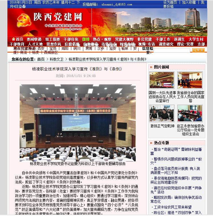 杨凌职业技术学院深入开展《准则》《条例》学习宣传,正逢年末岁首,各项工作处于收官和布局之中,各党总支、各部门把《准则》《条例》学习宣传作为一项重要内容,专题开展学习宣传。该院水利工程分院、经济与贸易分院、建筑工程分院、交通与测绘工程分院、生态环境工程分院等党总支书记组织全体党员开展专题学习和辅导;药物与化工分院党总支把《准则》《条例》学习与十八届五中全会精神学习相结合,作了全面的学习实施方案,并邀请纪检监察部门负责人参加全体党员学习研讨专题会;文理分院在学习宣传两项党内法规中,组织开展了《准则》《条例》知识答题活动;机关党工委以支部(处室)为单位,分别组织本部门党员干部开展集中学习活动。全院各党总支、机关工委各党支部对《准则》《条例》学习宣传情况进行了小结。《准则》《条例》的学习宣传正在该院深入开展。