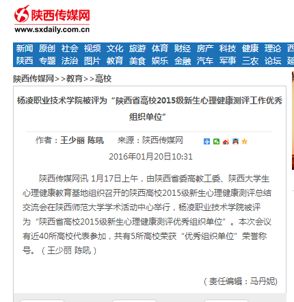 陕西传媒网讯 1月17日上午,由陕西省委高教工委、陕西大学生心理健康教育基地组织召开的陕西高校2015级新生心理健康测评总结交流会在陕西师范大学学术活动中心举行,杨凌职业技术学院被评为“陕西省高校2015级新生心理健康测评优秀组织单位”。本次会议有近40所高校代表参加,共有5所高校荣获“优秀组织单位”荣誉称号。