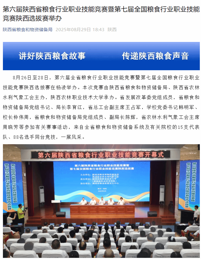 8月26日至28日,第六届全省粮食行业职业技能竞赛暨第七届全国粮食行业职业技能竞赛陕西选拔赛在杨凌举办。本次竞赛由陕西省粮食和物资储备局、陕西省农林水利气象工会主办,电子游艺官网承办。省发展改革委党组成员,省粮食和物资储备局党组书记、局长李育江,省总工会副主席王占军,学校党委书记韩明军、校长仲伟周,省粮食和物资储备局党组成员、副局长陈辉,省农林水利气象工会主席周晓芳等参加有关赛事活动,来自全省粮食和物资储备系统及有关院校的15支代表队、88名选手同台竞技,一展风采。