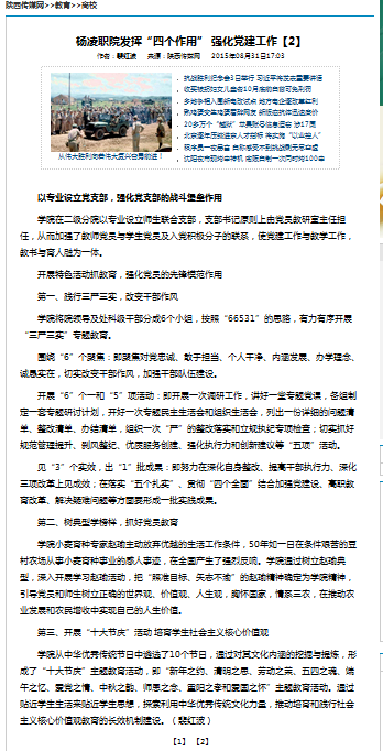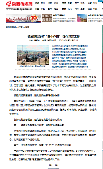 杨凌职业技术学院紧紧围绕党委的领导核心作用、党总支的政治核心作用、党支部的战斗堡垒作用、党员的先锋模范作用等“四个作用”的发挥,加强顶层设计,创新机制,完善制度,强化措施,不断提高党建科学化水平和治校兴校能力,为全面落实立德树人根本任务提供了坚强的思想和组织保证。