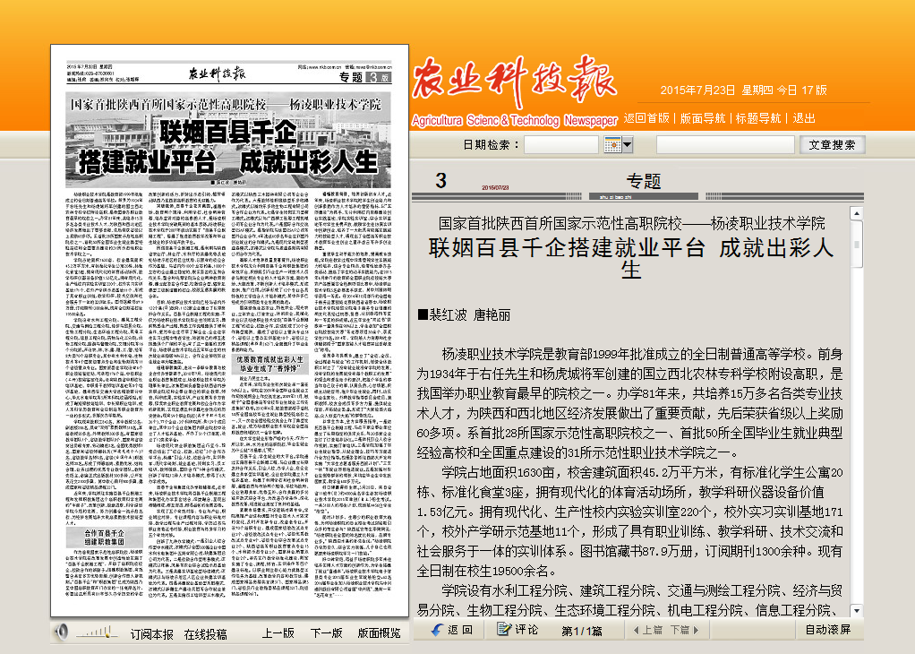 作为首批国家示范性高职院校,杨凌职业技术学院在改革发展中创造性地实施了“百县千企联姻工程”,开辟了高职院校校企校政合作的新路子。组建职教集团,有效整合共享多方优势资源,创新合作育人新机制。“百县千企”和“职教集团”已成为陕西乃至中国高职教育开门办学的一张亮丽名片,彰显出这所具有81年悠久办学历史的学校改革创新的活力,折射出示范引领、辐射带动陕西乃至西部高职教育的无穷魅力。