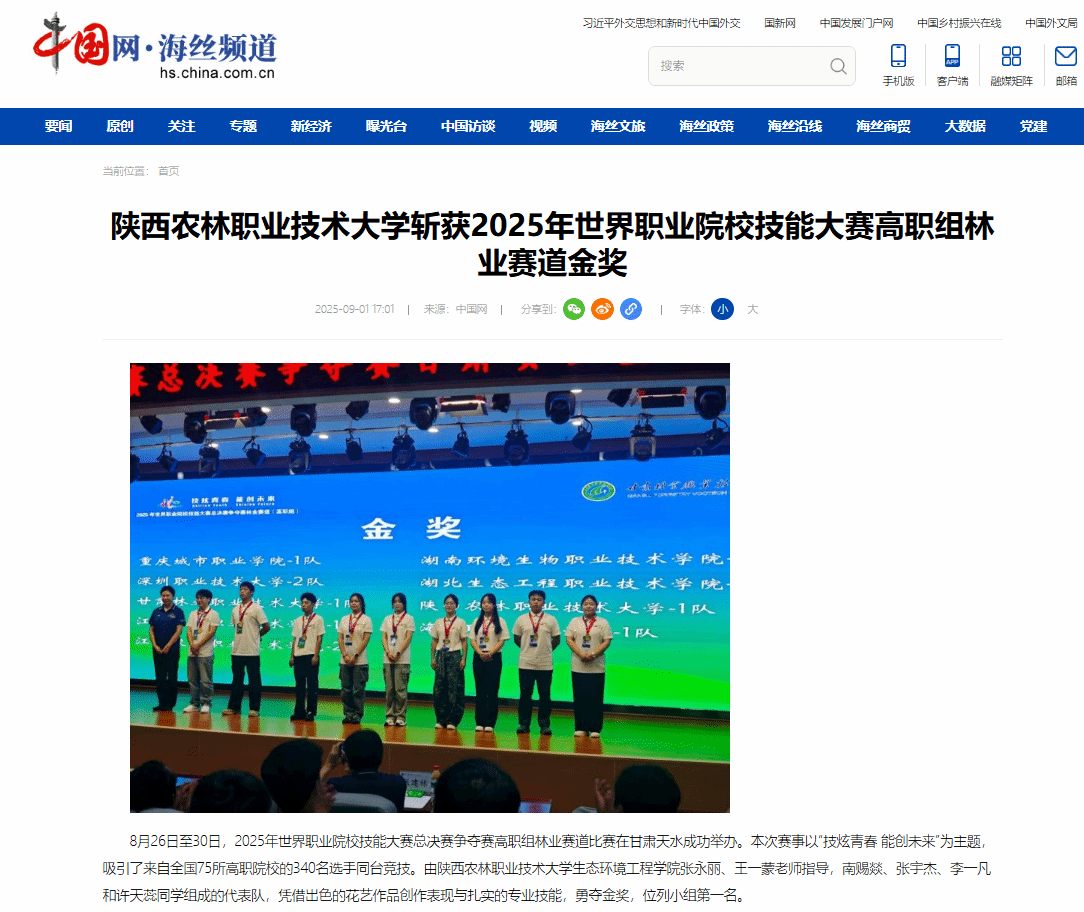 8月26日至30日,2025年世界职业院校技能大赛总决赛争夺赛高职组林业赛道比赛在甘肃天水成功举办。本次赛事以“技炫青春 能创未来”为主题,吸引了来自全国75所高职院校的340名选手同台竞技。由电子游艺官网生态环境工程学院张永丽、王一蒙老师指导,南赐燚、张宇杰、李一凡和许天蕊同学组成的代表队,凭借出色的花艺作品创作表现与扎实的专业技能,勇夺金奖,位列小组第一名。
