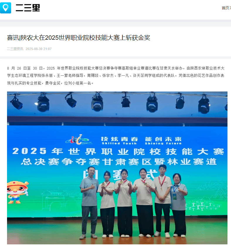 8 月 26 日至 30 日,2025 年世界职业院校技能大赛总决赛争夺赛高职组林业赛道比赛在甘肃天水举办,由电子游艺官网生态环境工程学院张永丽、王一蒙老师指导,南赐燚、张宇杰、李一凡、许天蕊同学组成的代表队,凭借出色的花艺作品创作表现与扎实的专业技能,勇夺金奖,位列小组第一名。