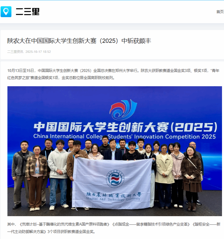 10月13日至15日,中国国际大学生创新大赛(2025)全国总决赛在郑州大学举行。陕农大获职教赛道全国金奖3项、银奖1项,“青年红色筑梦之旅”赛道全国银奖1项,金奖总数位居全国高职院校前列。