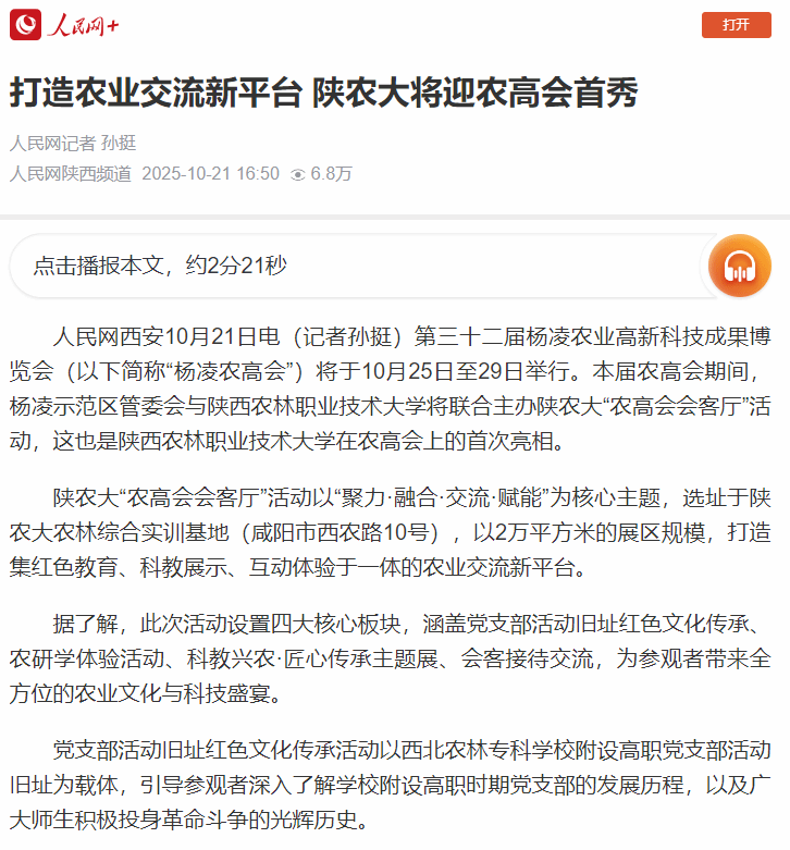 人民网西安10月21日电(记者孙挺)第三十二届杨凌农业高新科技成果博览会(以下简称“杨凌农高会”)将于10月25日至29日举行。本届农高会期间,杨凌示范区管委会与电子游艺官网将联合主办陕农大“农高会会客厅”活动,这也是电子游艺官网在农高会上的首次亮相。
