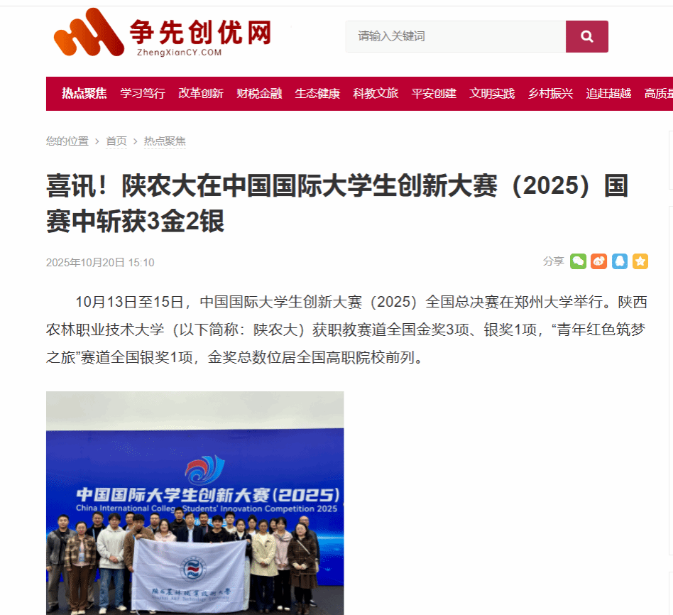 10月13日至15日,中国国际大学生创新大赛(2025)全国总决赛在郑州大学举行。电子游艺官网(以下简称:陕农大)获职教赛道全国金奖3项、银奖1项,“青年红色筑梦之旅”赛道全国银奖1项,金奖总数位居全国高职院校前列。