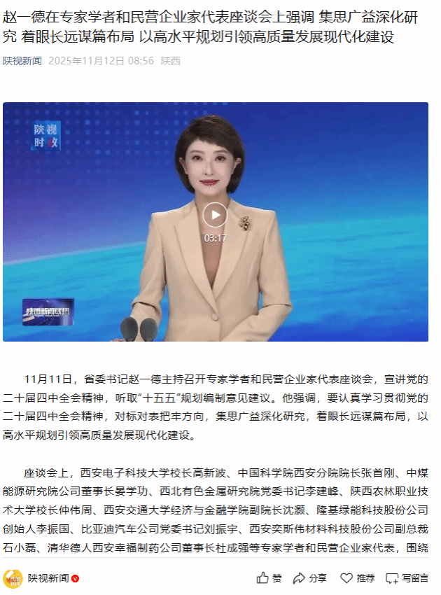 赵一德强调,“十五五”时期陕西必须坚持高质量发展主题,完整准确全面贯彻新发展理念,以科技创新引领新质生产力发展、构建现代化产业体系,以改革开放更好联通国内国际双循环,以城乡融合发展促进共同富裕,以发展方式绿色低碳转型提升生态文明建设水平,以统筹发展和安全守牢风险底线,推动经济实现质的有效提升和量的合理增长,更好满足三秦百姓日益增长的美好生活需要,奋力谱写中国式现代化建设的陕西新篇章。希望专家学者紧扣关系陕西发展的重大问题,发挥自身专长,深入调查研究,积极建言献策,为规划编制提供重要智力支撑。希望广大民营企业家秉持长期主义,持续改革创新,在优化供给、开拓市场、稳定就业等方面展现新担当新作为。有关部门要强化开门问策,把社会期盼、群众智慧、专家意见、基层经验充分吸收到规划编制中来,形成一个贯彻中央精神、符合发展规律、体现陕西特色的高质量规划。