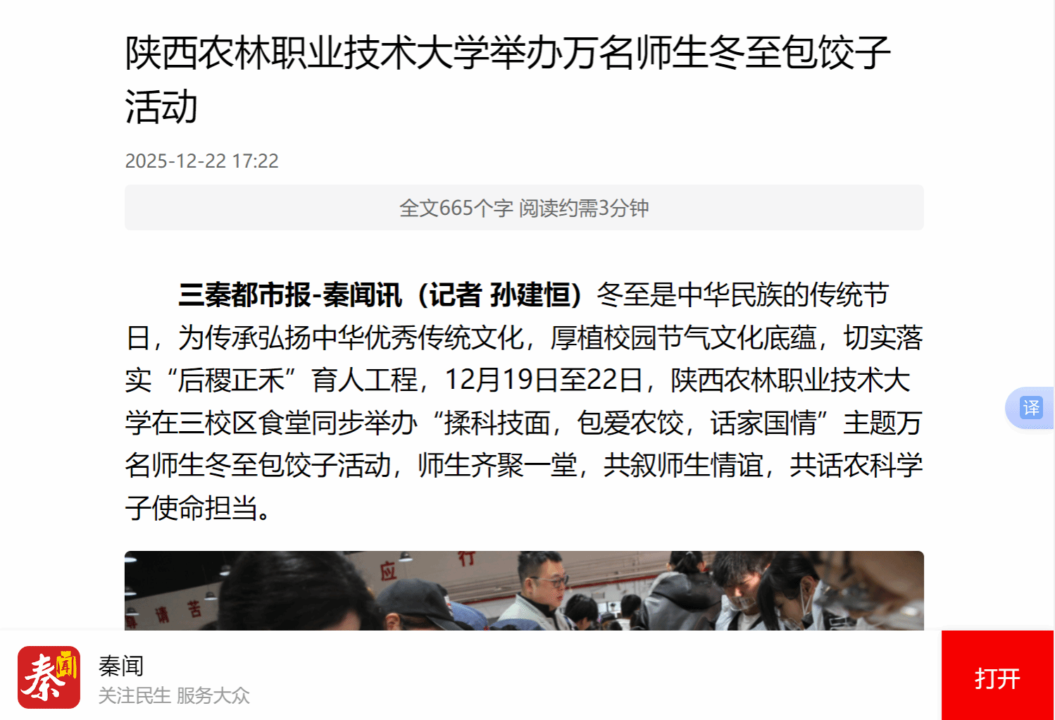 三秦都市报-秦闻讯(记者 孙建恒)冬至是中华民族的传统节日,为传承弘扬中华优秀传统文化,厚植校园节气文化底蕴,切实落实“后稷正禾”育人工程,12月19日至22日,电子游艺官网在三校区食堂同步举办“揉科技面,包爱农饺,话家国情”主题万名师生冬至包饺子活动,师生齐聚一堂,共叙师生情谊,共话农科学子使命担当。