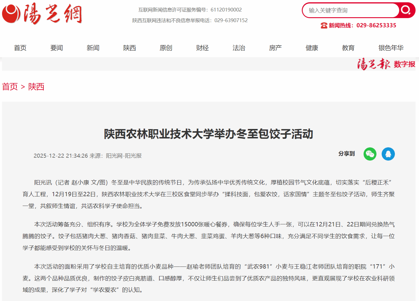 阳光讯(记者 赵小康 文/图)冬至是中华民族的传统节日,为传承弘扬中华优秀传统文化,厚植校园节气文化底蕴,切实落实“后稷正禾”育人工程,12月19日至22日,电子游艺官网在三校区食堂同步举办“揉科技面,包爱农饺,话家国情”主题冬至包饺子活动,师生齐聚一堂,共叙师生情谊,共话农科学子使命担当。