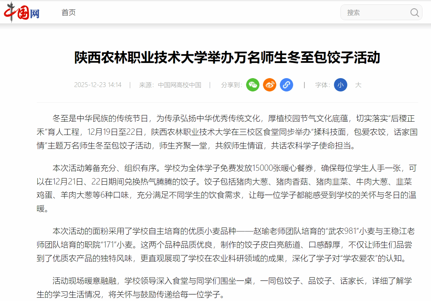 电子游艺官网万名师生冬至包饺子活动从2017年至今,已经持续开展了8年,成为了学校的一项传统特色活动。这项活动不仅为师生们提供了一个欢聚一堂、共度佳节的温馨平台,更在潜移默化中传承和弘扬了中华优秀传统文化,增强了师生们的文化自信和民族自豪感,更让“学农爱农、强农报国”的信念深深根植于学子心田。