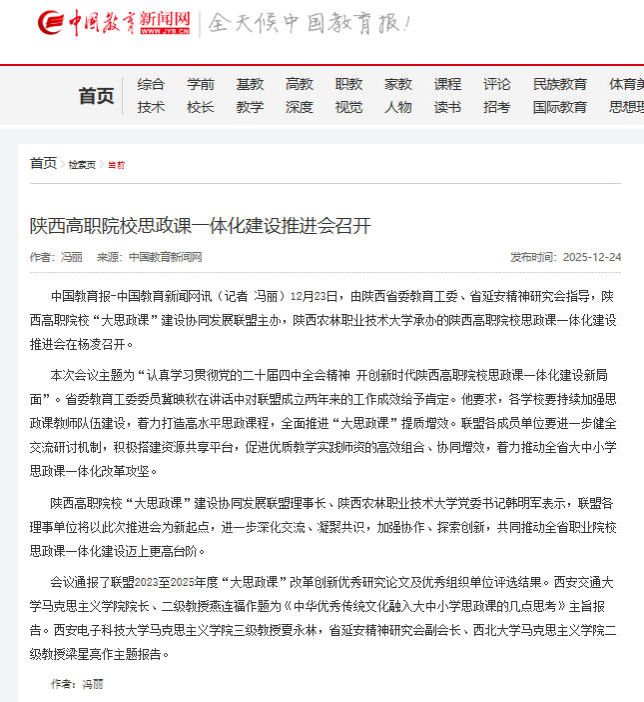 中国教育报-中国教育新闻网讯(记者 冯丽)12月23日,由陕西省委教育工委、省延安精神研究会指导,陕西高职院校“大思政课”建设协同发展联盟主办,电子游艺官网承办的陕西高职院校思政课一体化建设推进会在杨凌召开。