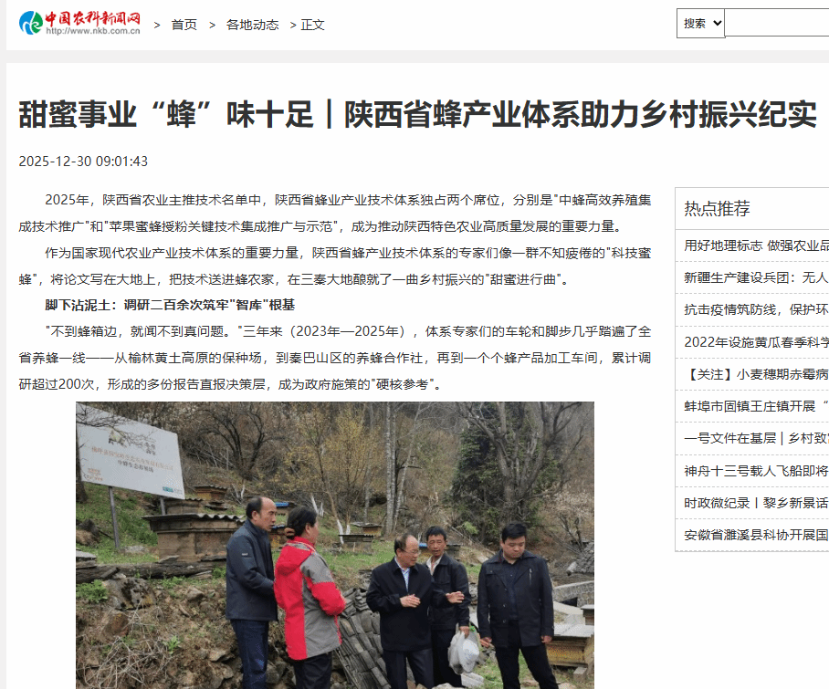 2025年,陕西省农业主推技术名单中,陕西省蜂业产业技术体系独占两个席位,分别是"中蜂高效养殖集成技术推广"和"苹果蜜蜂授粉关键技术集成推广与示范",成为推动陕西特色农业高质量发展的重要力量。