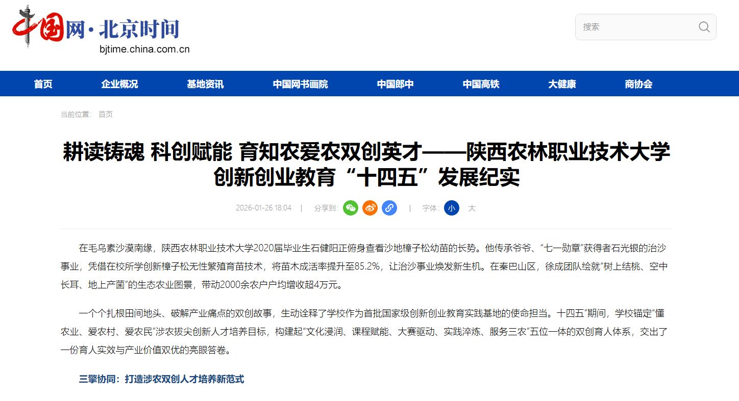 “让学生带着泥土芬芳成长,把论文写在大地上。”这是学校双创教育的核心理念。学校以“后稷正禾”育人工程为引擎,将农耕文化、红色基因融入双创教育全链条,构建“党建领航定向+农耕文化培根+红色筑梦赋能+陕农精神铸魂”的四维育人格局。依托“双创训练营+红旅实践行+技术帮扶团”立体化活动矩阵,年均开展双创品牌活动50余场,覆盖师生超2.6万人次。《抚沙为茵点沙成金》等4个案例入选陕西省2025年“青年红色筑梦之旅”典型案例。“治沙精神”“赵瑜精神”已成为学校思创融合的精神坐标,引领师生在服务“三农”中锤炼过硬本领。