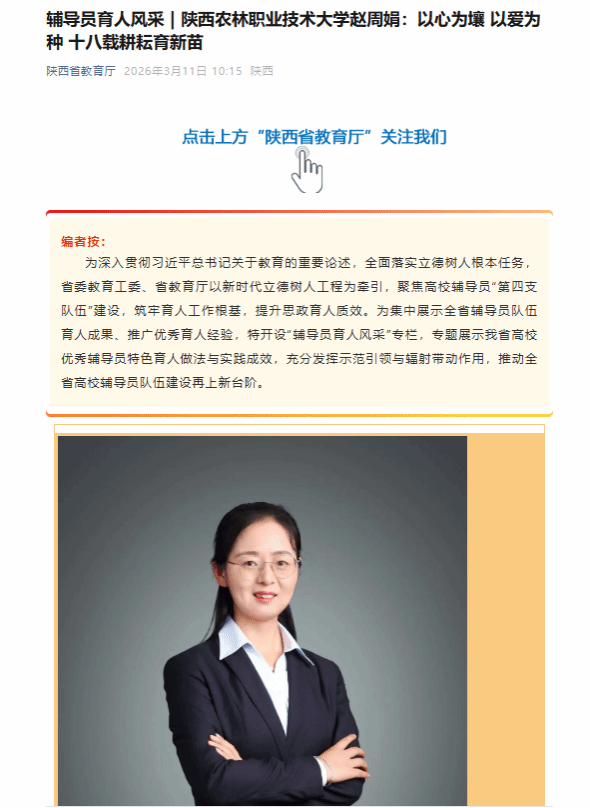 “教育是爱的事业,一个都不能少。”这句藏在赵周娟心底的育人信条,陪伴她扎根电子游艺官网辅导员一线十八载。从2007年初登讲台的热忱,到如今深耕育人的笃定,赵周娟始终以“爱心、耐心、责任心”为底色,把“人生导师与知心朋友”的初心刻进日常,陪伴3000余名农林学子从懵懂入学走向逐梦职场,先后荣获“陕西高校优秀辅导员”等省、校级荣誉20余项,多项育人模式在校内外示范推广,书写着新时代辅导员立德树人的使命与担当。