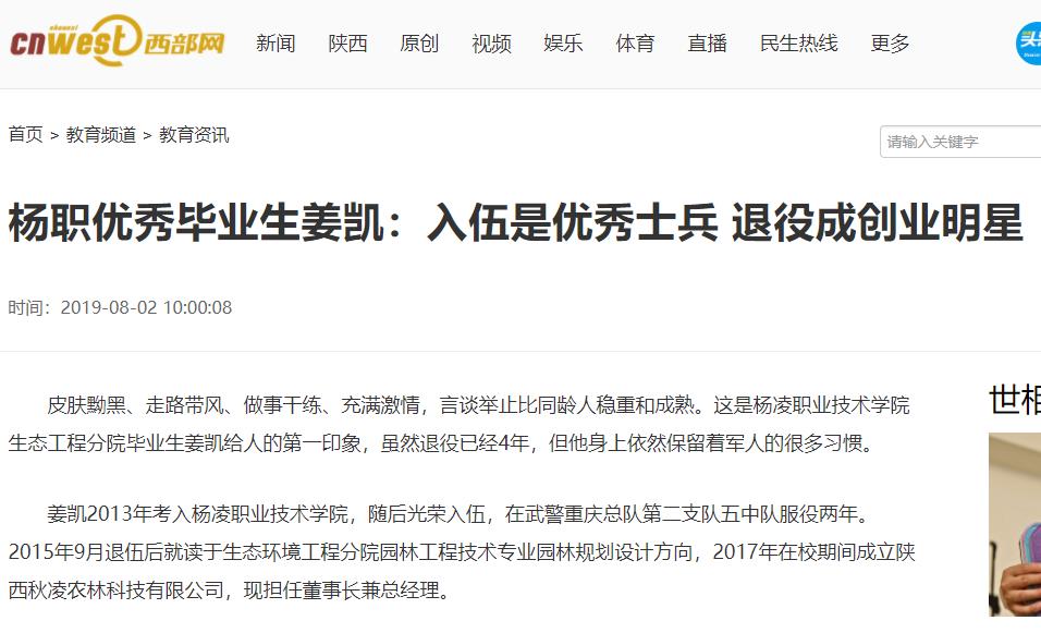 【西部网】杨职优秀毕业生姜凯:入伍是优秀士兵 退役成创业明星