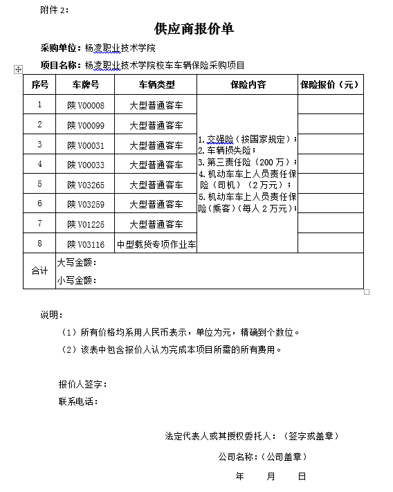 2.杨凌职业技术学院校车车辆保险采购项目报价单;