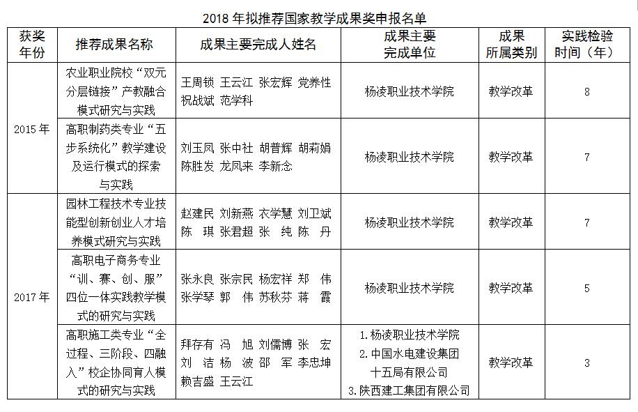 根据教育部《关于开展2018年国家级教学成果奖评审工作的通知》(教师函[2018]3号)及教育厅办公室下发《关于开展2018年国家级教学成果奖推荐工作的通知》要求,我院2015年和2017年获省级教学成果奖共7项,符合2018年国家教学成果奖推荐条件的5项。现将拟推荐的5项成果名称、成果主要完成人、成果完成单位、成果所属类别及成果实践检验时间(年)进行公示。