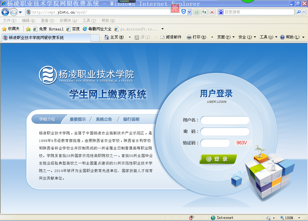 根据我院十三五规划和财务处2016年的工作计划,本着节约成本,方便管理的原则,我院与中国农业银行杨凌示范区支行及天财财务软件公司三方联合开发的杨凌职业技术学院学生网上缴费平台已安装调试完成,现正式上线试运行了!(网址:http://cwpt.ylvtc.cn/wysf/)