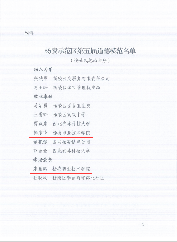 11月30日,杨凌示范区公布了第五届道德模范名单,学校生态工程学院教师韩东锋获“敬业奉献”道德模范,水利工程学院教师朱显鸽获“孝老爱亲”道德模范。