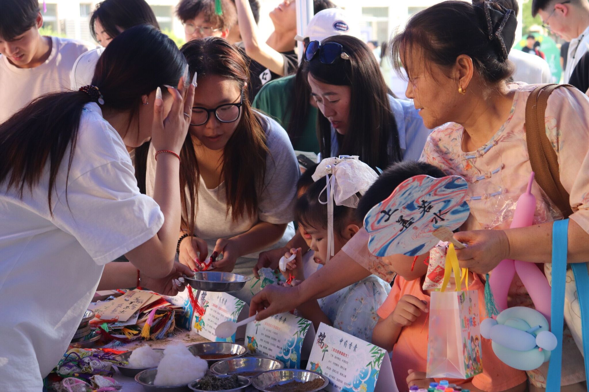 “拾艺端午”非遗技艺体验区亮点纷呈。药物与化工学院“药香廿四候”主题展区,巧妙融合二十四节气与传统中草药智慧,中药制药专业学生带领师生制作含有艾草、陈皮、丁香等中药材的特色香囊。水利工程学院、交通与测绘工程学院现场展示秦砖汉瓦拓印技艺,动物工程学院精心设置非遗缠花工作坊,建筑工程学院开展艾草养生枕制作教学,机电工程学院、旅游与管理学院设置漆扇绘制、帆布包拓印等创意项目。参与者纷纷感慨“像开启了一场穿越千年的文化盲盒之旅”。